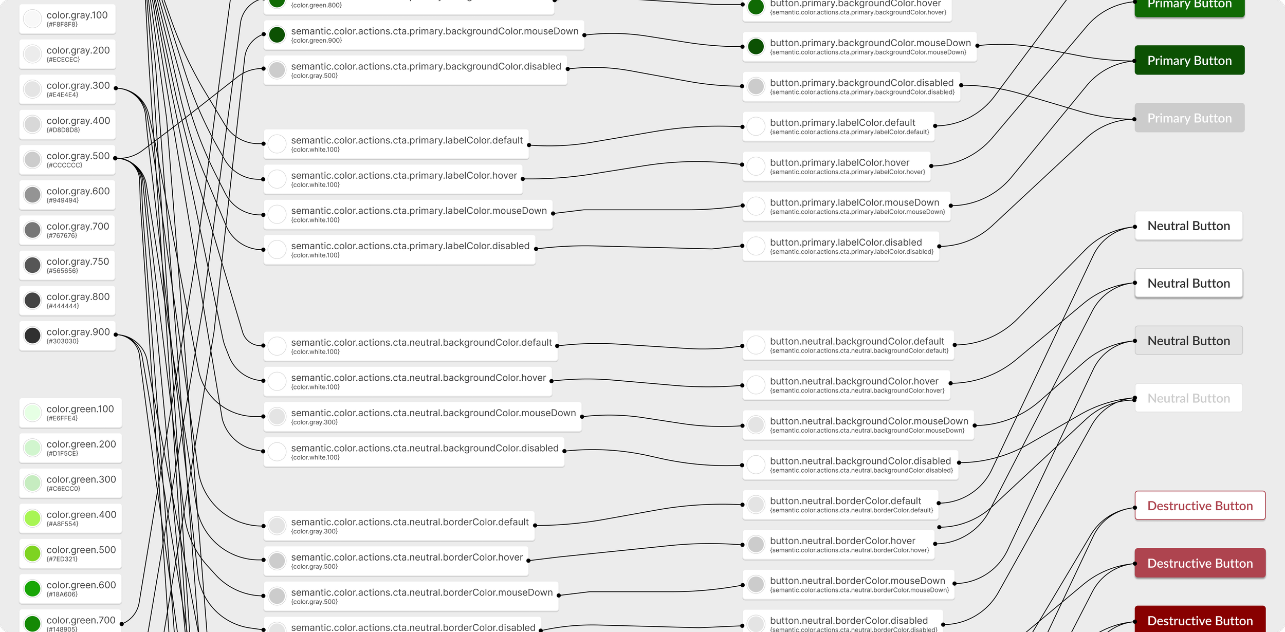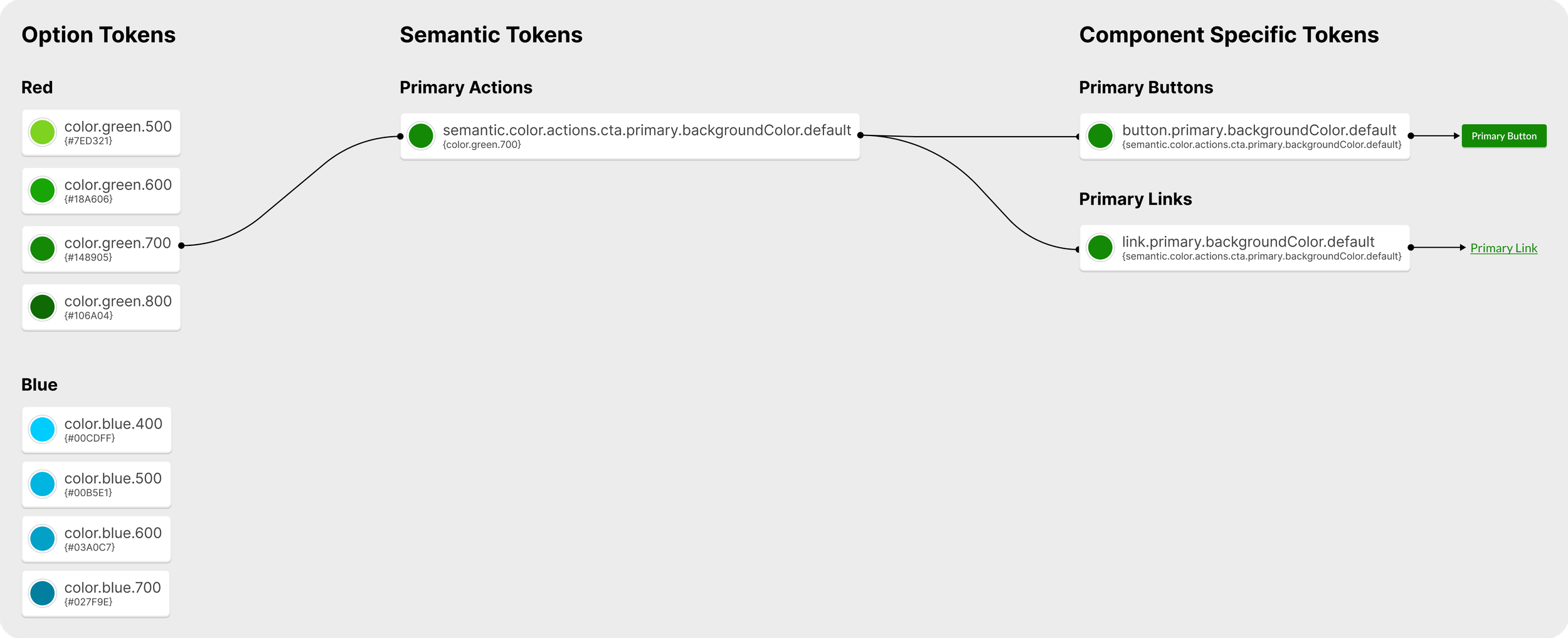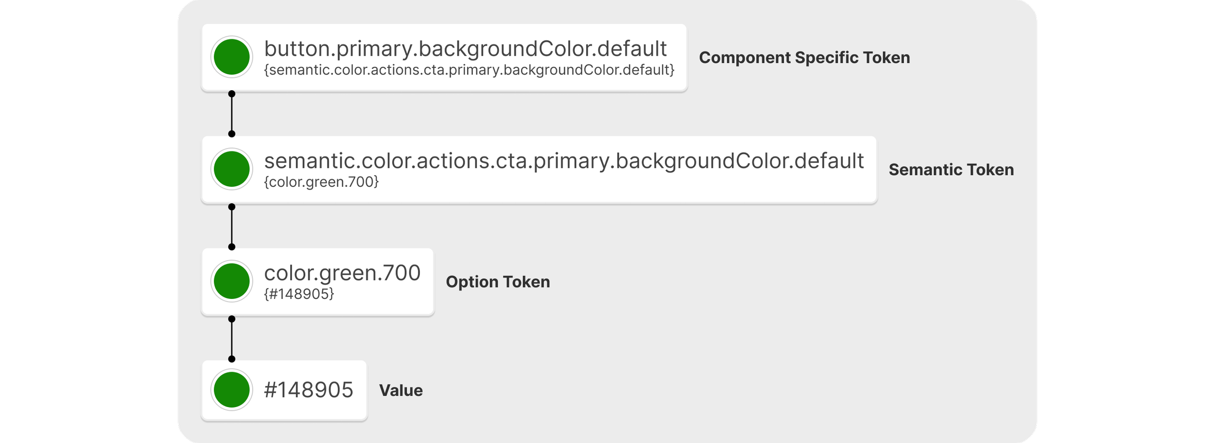 The second tier of abstraction was semantic tokens. Semantic tokens needed to have a purpose within a context but be abstract enough to adapt to different values. For example, a semantic token might say that the background for all primary calls-to-action was green.700. Any call-to-action with this purpose would have that background color.