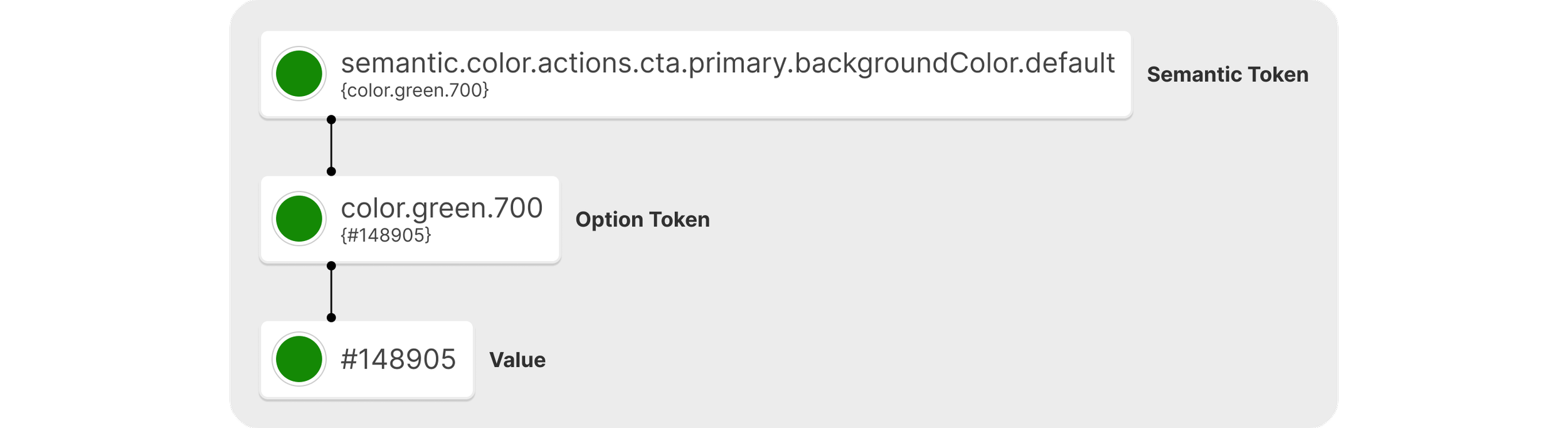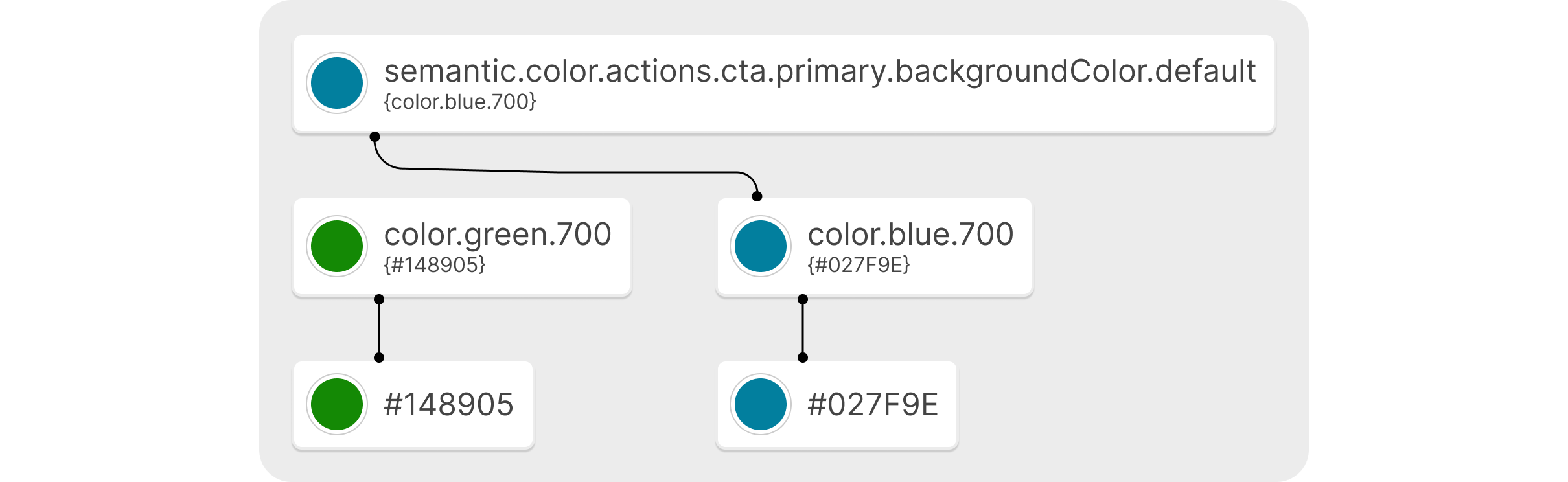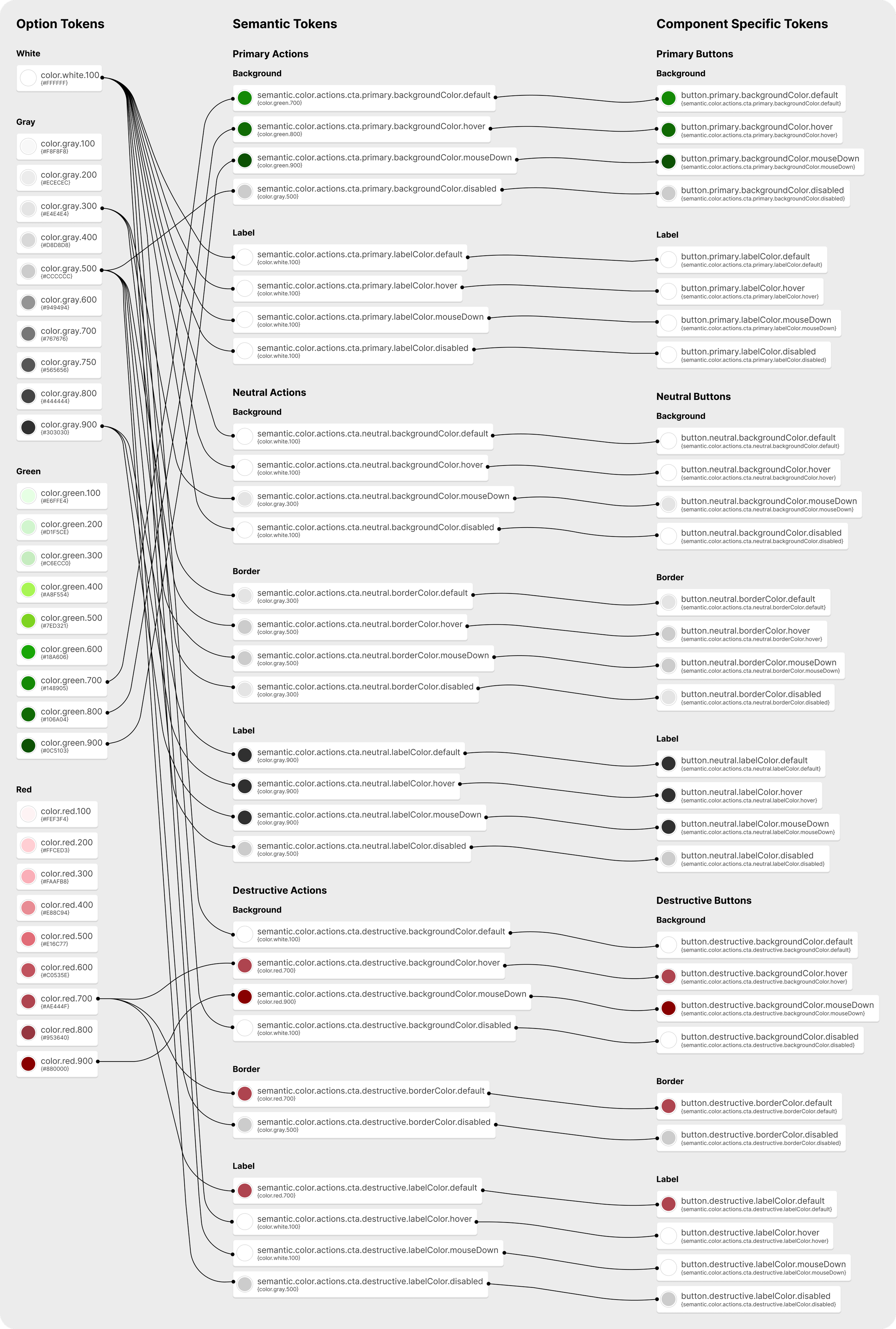 The second tier of abstraction was semantic tokens. Semantic tokens needed to have a purpose within a context but be abstract enough to adapt to different values. For example, a semantic token might say that the background for all primary calls-to-action was green.700. Any call-to-action with this purpose would have that background color.