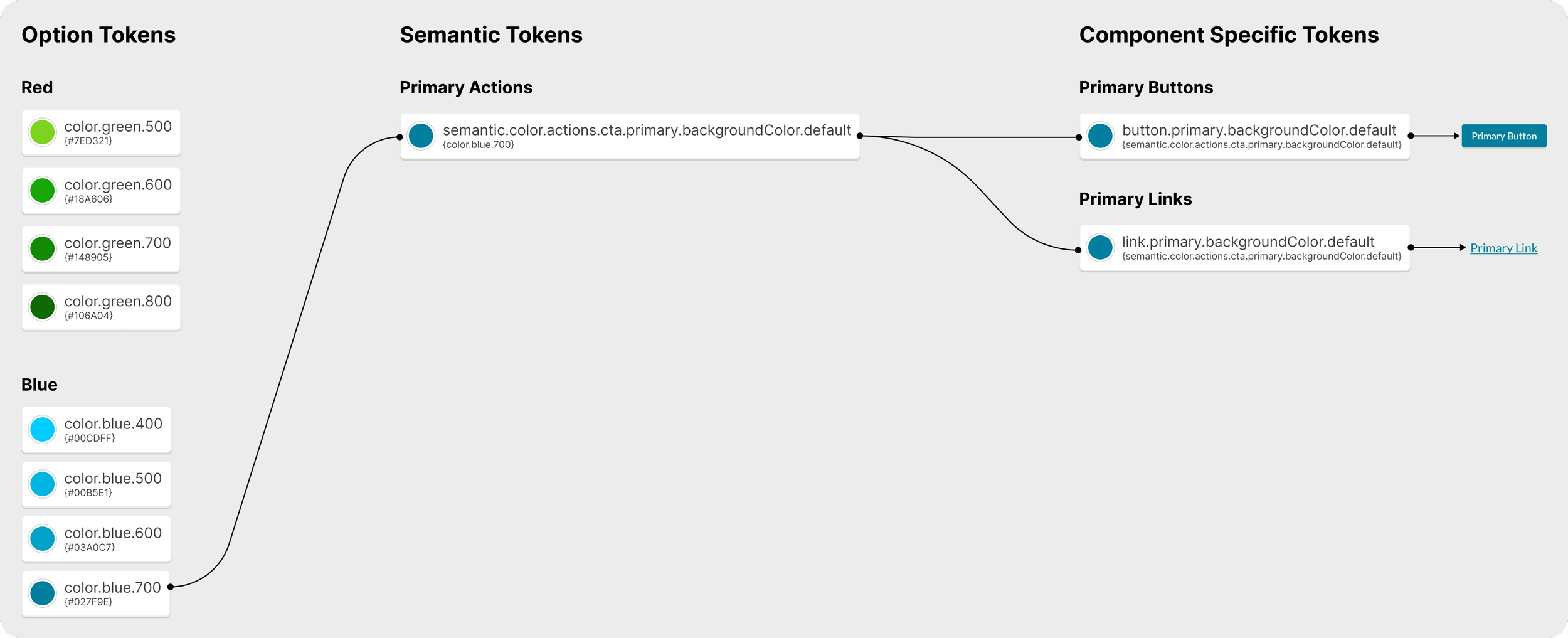 If we wanted our primary calls-to-action to be blue instead, I could switch the option token referenced to a blue. This change would cascade downwards instantaneously to all our primary calls-to-action.